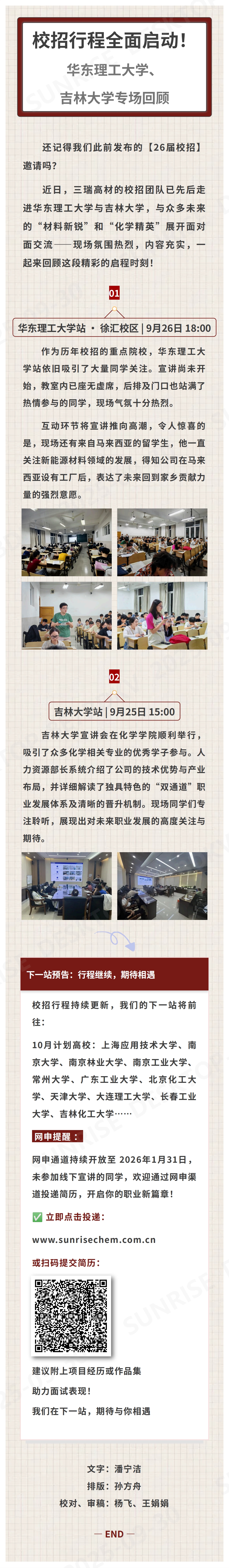 近日,三瑞高材的校招团队已先后走进华东理工大学与吉林大学,与众多未来的“材料新锐”和“化学精英”展开面对面交流——现场氛围热烈,内容充实,一起来回顾这段精彩的启程时刻!