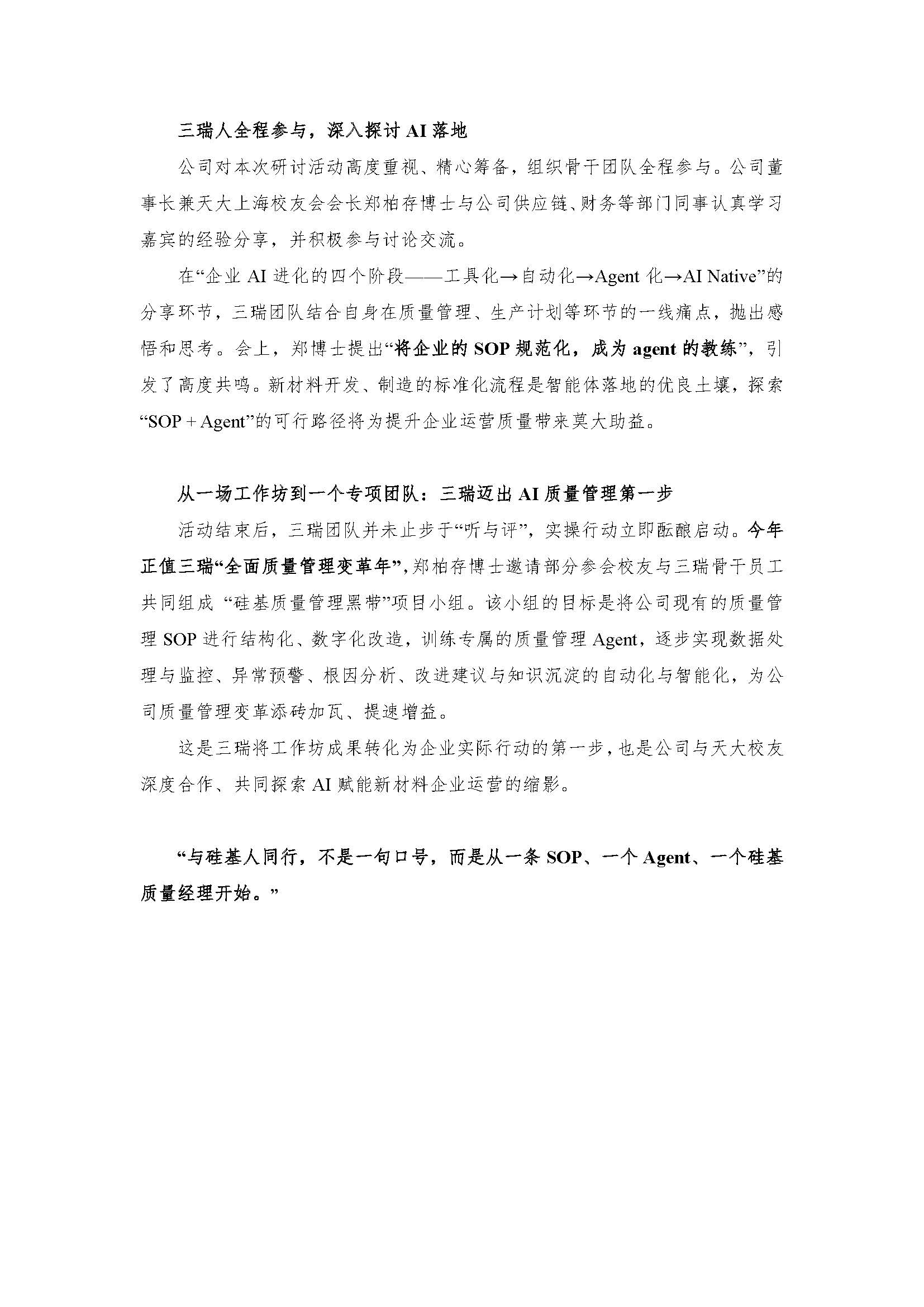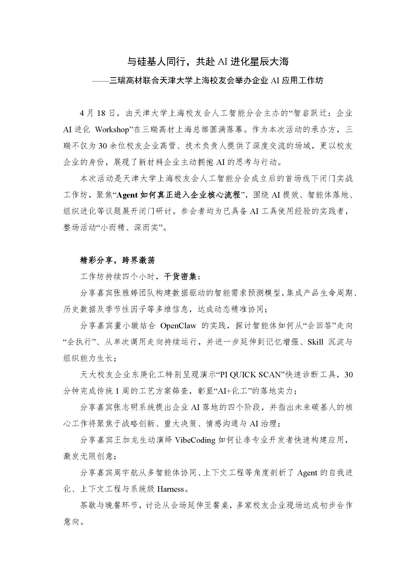 4 月18 日,由天津大学上海校友会人工智能分会主办的“智启跃迁:企业AI 进化Workshop”在三瑞高材上海总部圆满落幕。作为本次活动的承办方,三瑞不仅为30 余位校友企业高管、技术负责人提供了深度交流的场域,更以校友企业的身份,展现了新材料企业主动拥抱AI 的思考与行动。